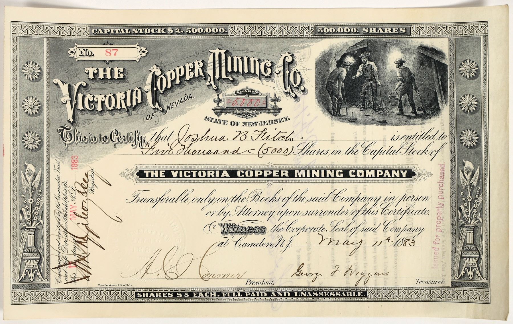 Inc. in New Jersey. No. 87, issued for 5,000 shares to Joshua B. Fitch in Camden in 1883. Signed by president A. Carmer and the treasurer. Not cancelled. Ornate border and underground mining vignette. Clean. This company operated in the Dolly Varden Mining District in Elko County. In 1872 the copper ore at the Victoria was opened and for about two years was actively worked, the ores being smelted in a Mexican furnace at Dolly Varden Spring. The Victoria mine is on the east side of the mountains about halfway between the summit and Watson Spring in the south fork of Watson Canyon. We also found them applying for a patent to the Niantie Mine in the Kinsley Mining District, Elko County (White Pine News, Dec. 29, 1883)
