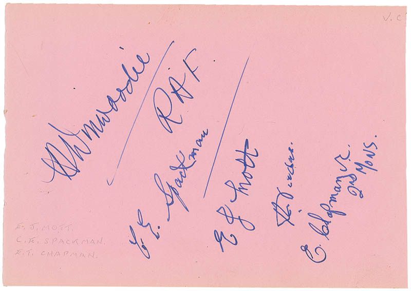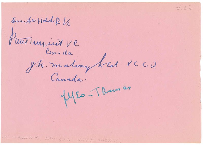 Vintage ink signatures of six World War I and World War II Victoria Cross recipients on both sides of a 4.75 x 7 pink album page. Signers are: Edw. John Mott, Charles Edward Spackman, Edw. Thomas Chapman, John Keefer Mahony, Geo. Randolph Pearkes, and Paul Triquet. In fine condition, with some slight edge toning and a few pencil notations.