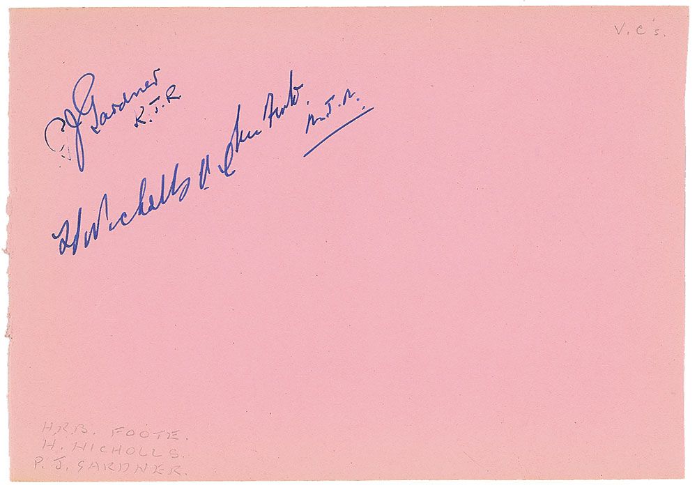 Vintage ink signatures of three British soldiers who were awarded the Victoria Cross on a light pink 7 x 4.75 album page. Signers are: Philip John Gardner, “P. J. Gardner R.T.R.,” Harry Nicholls, “H. Nicholls L.C.,” and Henry Robert Bowreman Foote, “Hen. Foote R.T.R,” with small pencil notations to lower left. In fine condition.