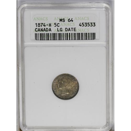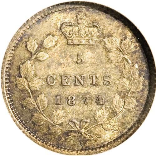 <B>Victoria 5 Cents 1874-H Crosslet 4,</B></I> KM2, MS64 ANACS. Mottled green and gold toning over full underlying luster.<BR><I>From the Dominion Collection.</B></I>