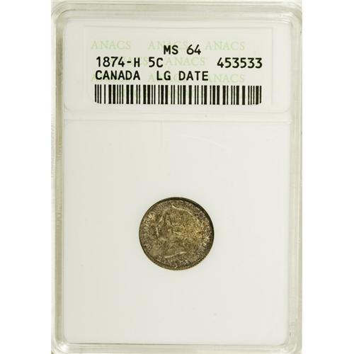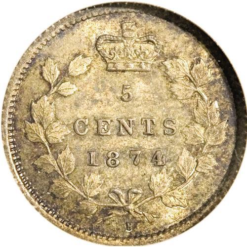 <B>Victoria 5 Cents 1874-H Crosslet 4,</B></I> KM2, MS64 ANACS. Completely original and very attractive with deep green and gold toning over full underlying luster. Very rare in this select quality. <BR><I>From the Dominion Collection.</B></I><BR><BR><b>Shipping:</b> Coin/Currency (<a target="_blank" href="http://www.heritageauctions.com/common/shipping.php">view shipping information</a>)