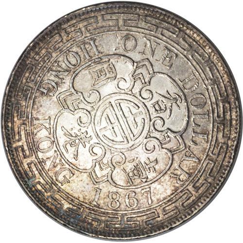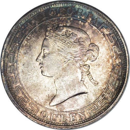 <B>Victoria Dollar 1867, </B></I>KM10, toned XF, typical contact marks on the obverse, quite attractive with blue-green and russet patina.