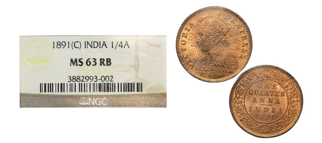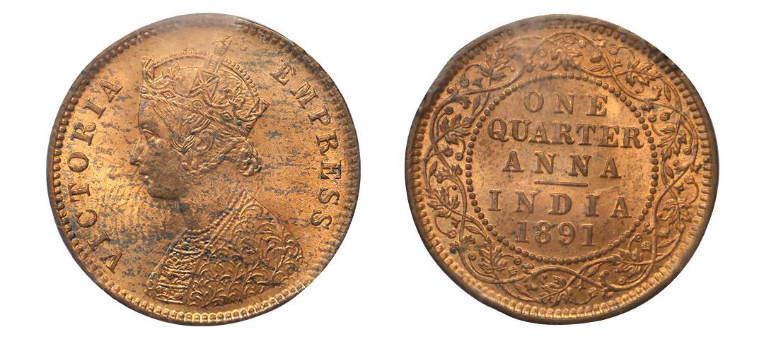 Victoria Empress, Copper ¼ Anna, 1891, Calcutta Mint (Prid 624). Graded by NGC MS63 RB.