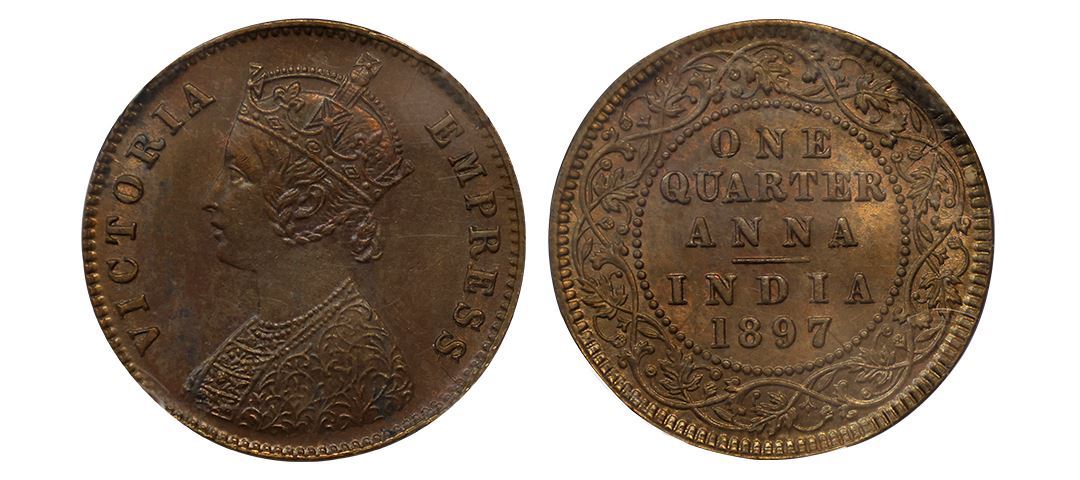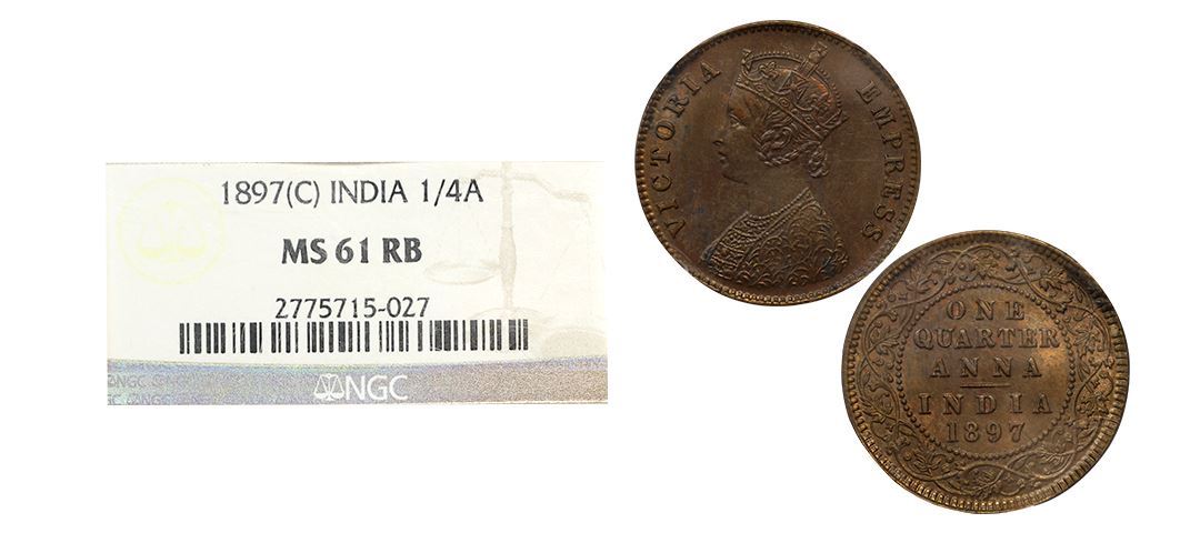 Victoria Empress, Copper ¼ Anna, 1897, Calcutta Mint, (Prid 630). Graded by NGC MS61RB