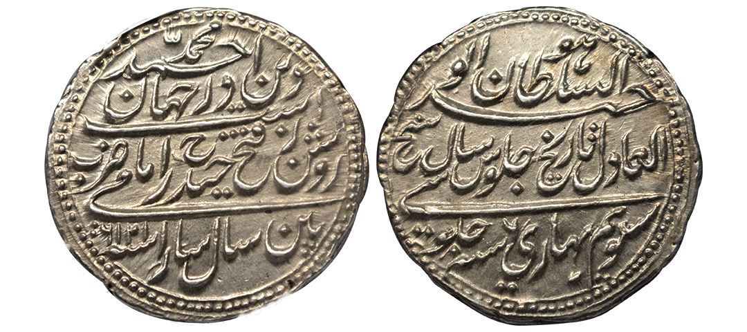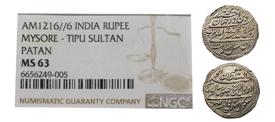 Mysore, Tipu Sultan (1782-1799 AD), silver rupee or 'Imami', Pattan mint, dated Mauludi year 1216, 'Sara' RY 6 'Sakh', KM 126,. Obv: Farsi legend Huw al-Sultan al-Wahid al-Adil Tarikh Jalus sakh sueem Bahari Sanah 6 Julusi. Rev: Farsi legend Muhammad Ahmad Deendar Jahan Ast Roshanza Fateh haider imaizarb pattan sal sara sanah 1216. NGC Graded MS63, Very rare.