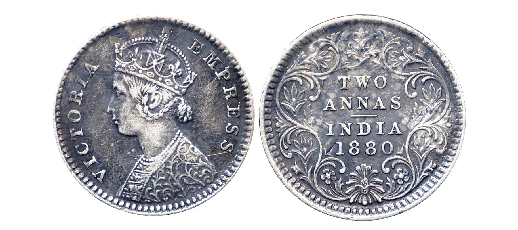 Victoria Empress, Silver 2 Annas, 1880, Calcutta Mint, C incuse, (Prid 495).