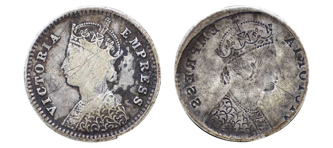 Victoria Empress, Silver 2 Annas, Error, Brockage, nice deep and complete lakhi impression on rev. S