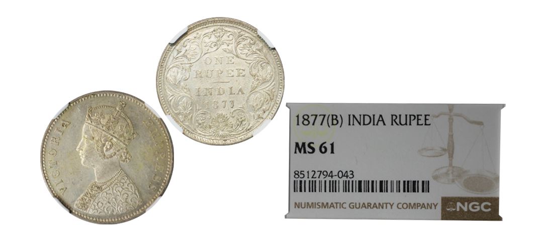 Victoria Empress, Silver Rupee, 1877, Bombay Mint, A3/II, dot, Superb Mint State Specimen with Attractive Appearance. Graded By NGC as MS 61. Very Rare