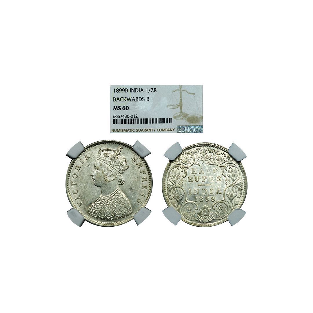 Victoria Empress, Silver ½ Rupee, 1899B, BACKWARDS ‘B’. MS 60 Graded