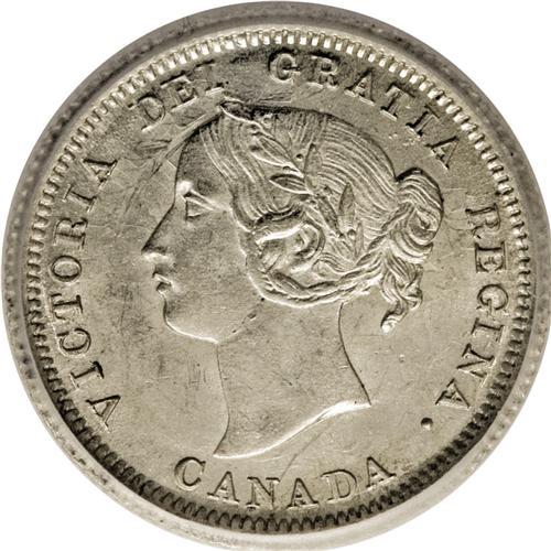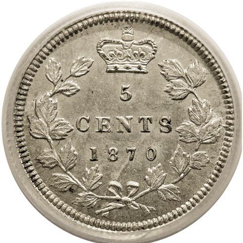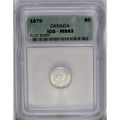 <B>Victoria 5 Cents 1870 Wide Border (Flat Border),</B></I> KM2, MS63 ICG. Lustrous and brilliant-white with noticeable die clash marks in the left obverse field. A very attractive piece for the grade.<BR><I>From the Dominion Collection.</B></I>
