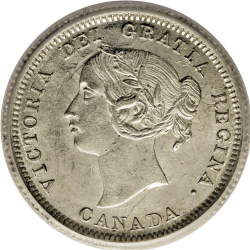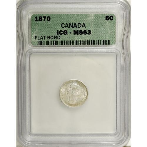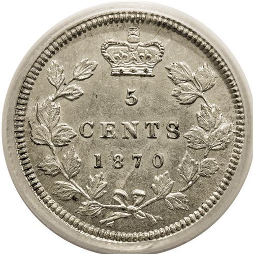 <B>Victoria 5 Cents 1870 Flat Border,</B></I> KM2, MS63 ICG. Frosty white luster with noticeable die clash marks in the left obverse field. A very attractive piece for the grade.<BR><I>From the Dominion Collection.</B></I><BR><BR><b>Shipping:</b> Coin/Currency (<a target="_blank" href="http://www.heritageauctions.com/common/shipping.php">view shipping information</a>)