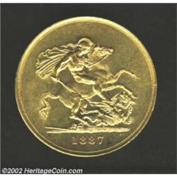 Victoria Gold 5 Pounds 1887 KM169, Uncirculated, fittingly, this year marks the golden anniversary of Queen Victoria's reign. A few wispy lines in the obverse fields from brief circulation, otherwise excellent luster. Important notice: We expect to be auctioning lots at the rate of 200-250 per hour. Sometimes eBay Premier live bid software cannot keep up with that pace, so we strongly recommend that you place a realistic proxy bid now as insurance to avoid disappointment. Also please note that all Heritage/CAA lots purchased through eBay Premier carry a 20% Buyer's Premium. Please make sure you read the Terms and Conditions.
