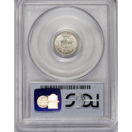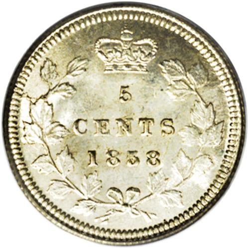 <B>Victoria 5 Cents 1858 Large Date,</B></I> KM2, MS64 PCGS. Fully lustrous with a light golden haze. The Small Date is quite evident beneath the 858 of the date. Equal in condition to the Belzberg specimen. Only one piece has been certified finer by PCGS.<BR><I>From the Dominion Collection.</B></I>