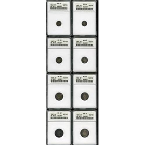 <B>Victoria Maundy type pair: </B></I>1867 set, Victoria young head, S-3916, as follows: 1d MS66, 2d MS65, 3d MS64, 4d MS62 ANACS, shades of golden blue and mauve toning. Together with: 1892 set, Victoria jubilee head, S-3932, as follows: 1d MS64, 2d MS63, 3d MS63, 4d MS64 ANACS, all with beautiful blue and mauve iridescent toning.