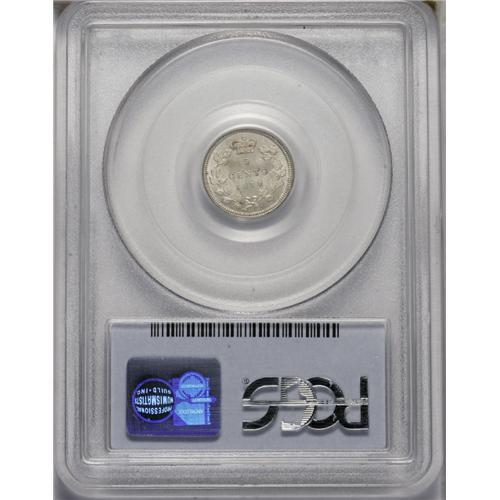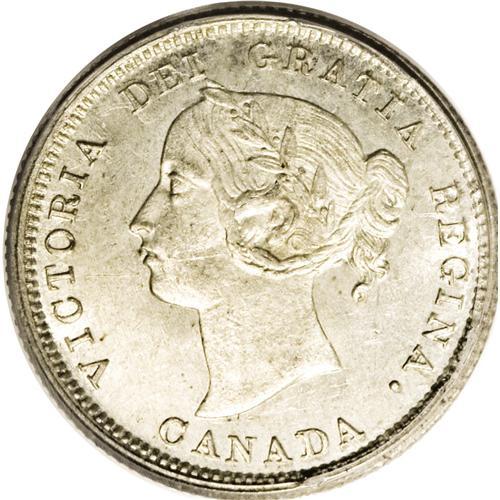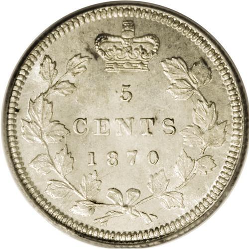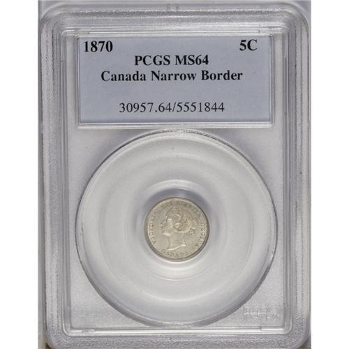 <B>Victoria 5 Cents 1870 Narrow Border (Raised Border),</B></I> KM2, MS64 PCGS. A prooflike obverse with a satin reverse and quite a bit of die clashing on the obverse. Only two pieces have been certified finer by PCGS.<BR><I>From the Dominion Collection.</B></I> <BR><BR><B>Important n