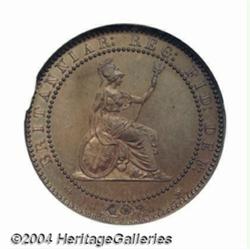 Victoria Pattern Halfpenny 1859, Peck-2017 (Extremely Rare), Proof 66 Red and Brown NGC. Nicely mirrored fields with considerable mint red color remaining. The portrait is from the punch used on the Shillings of this era. Important notice: Heritage usually auctions material at the rate of 200-250 lots per hour. On some occasions eBay Live bid software or the Internet may not be able to keep up with the pace of the auction. We recommend placing a realistic absentee bid now as insurance to avoid disappointment. Occasionally the auctioneer may eliminate or reject an eBay Live bid, and the auctioneer may also reopen a lot after the close of the eBay live bidding (usually because we missed an audience bid), and may reject your bid even if it shows you as the winning bidder. By bidding via eBay Live, you agree that Heritage may award the lot to another bidder at its sole discretion under the circumstances described above or any other reasonable circumstances. Also please note that all Heritage lots purchased through eBay Live carry a 20% Buyer's Premium. Please make sure you read the Terms and Conditions before you bid.