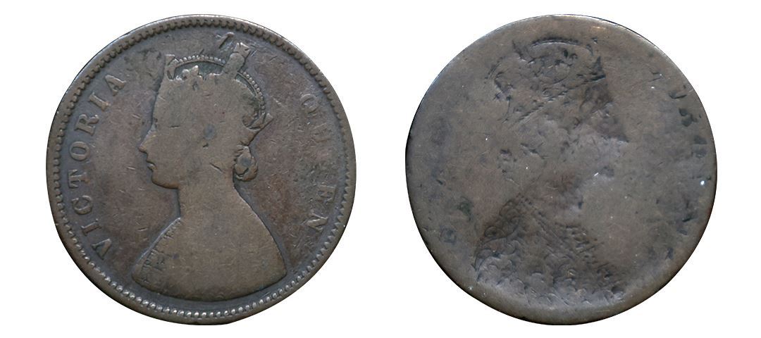 Victoria Queen, Copper ½ Anna, 1862-1876, Error, Brockage, nice deep and complete lakhi impression on rev. About Very Fine, Very Rare.