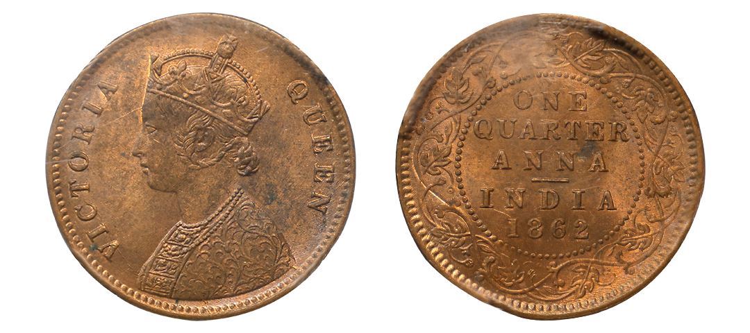 Victoria Queen, Copper ¼ Anna, 1862, Madras Mint (Prid 604). Graded by NGC MS63RB.