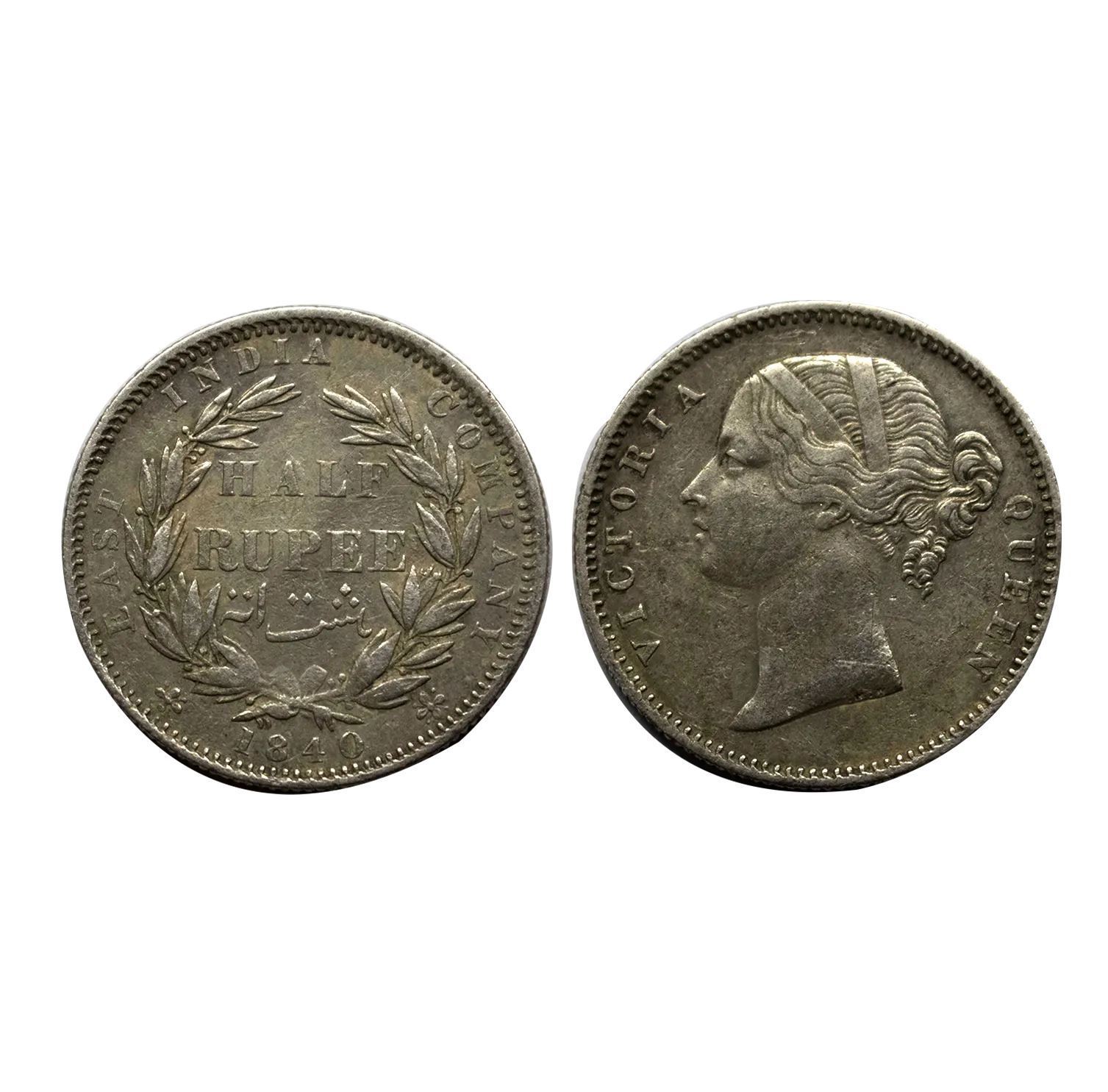 Victoria Queen, Silver 1/2, 1840, divided legend, Calcutta/ Bombay Mint, 24 berries,