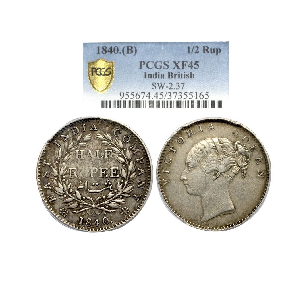 Victoria Queen, Silver 1/2 Rupee, 1840, Continuous Legends, Bombay Mint, Graded XF45 by PCGS, Rare.