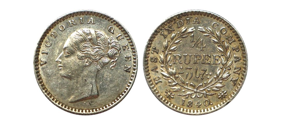 Victoria Queen, Silver 1/4 Rupee, Continuous legend, 1840