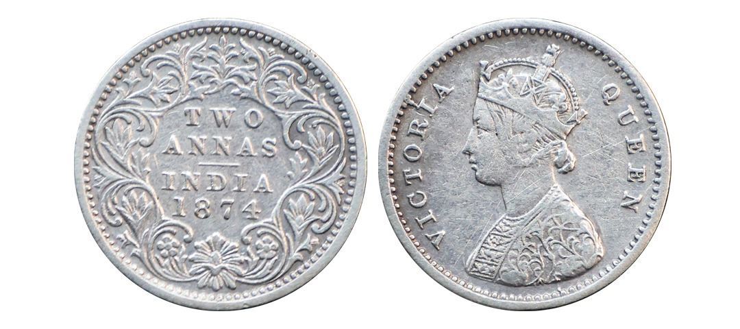 Victoria Queen, Silver 2 Annas, 1874, Calcutta Mint,