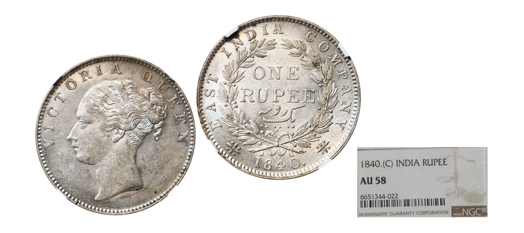 Victoria Queen, Silver Rupee, 1840, Continuous Legend, Calcutta Mint, 19 berries, (L-10 + R-9), Graded by NGC AU58.