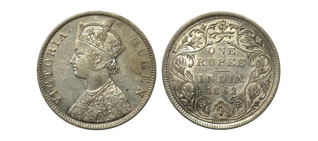 Victoria Queen, Silver Rupee, 1862, B/II, Single Pineapple Buds Above 'O' of ONE