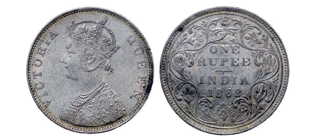 Victoria Queen, Silver Rupee, 1862, Calcutta Mint, B/II, 4, Pineapple buds variety.