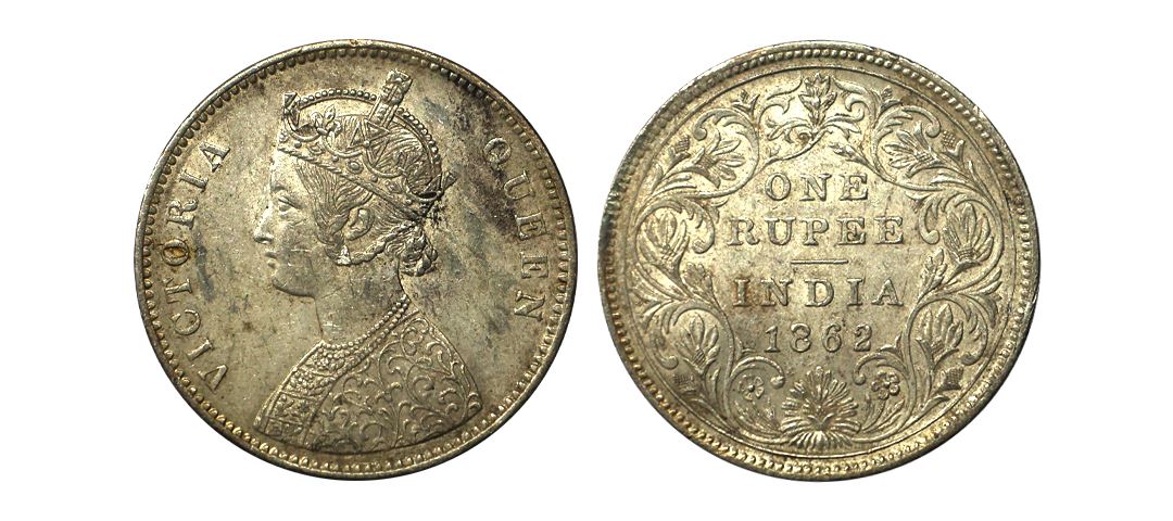 Victoria Queen, Silver Rupee, 1862, A/II, 0/0 dots, Mule, Non-Dottes Reverse Comes With Bust B, But In This Variety It Comes With Obverse A, About Uncirculated, Very Rare.
