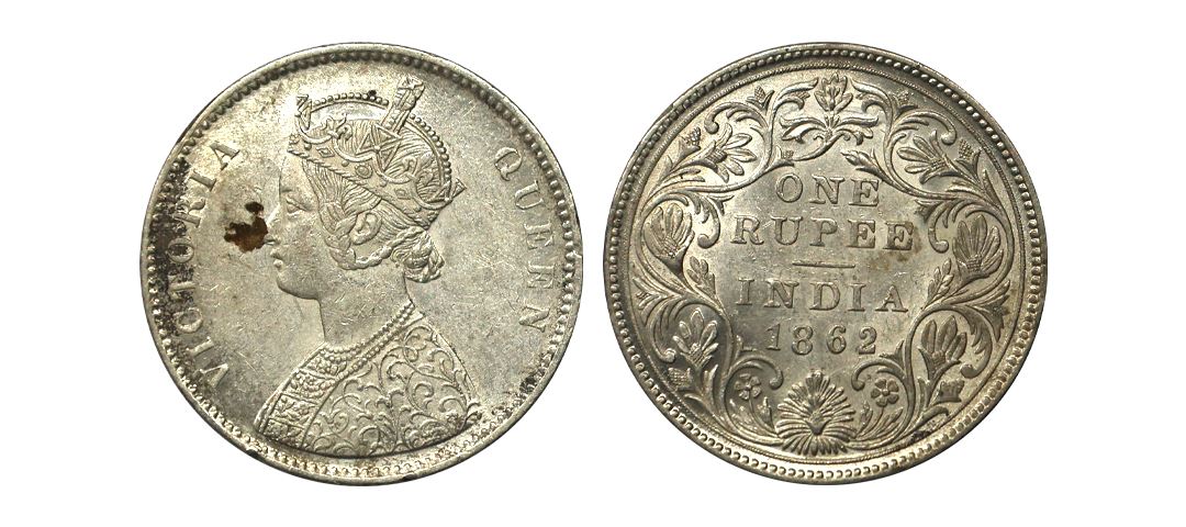 Victoria Queen, Silver Rupee, 1862, A/II, 3 Pineapple Buds On Reverse, About Uncirculated, Rare.