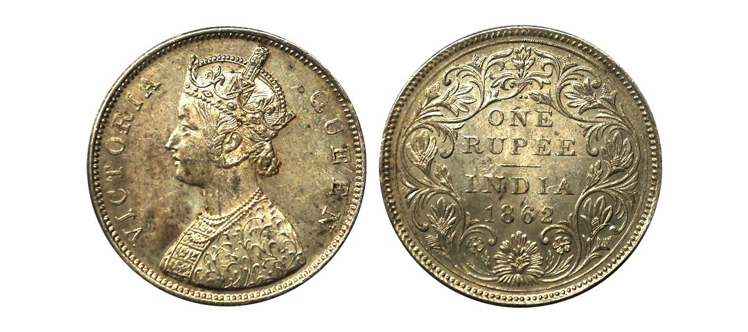 Victoria Queen, Silver Rupee, 1862, B/II, 2/0 Dots, About Uncirculated, Rare.