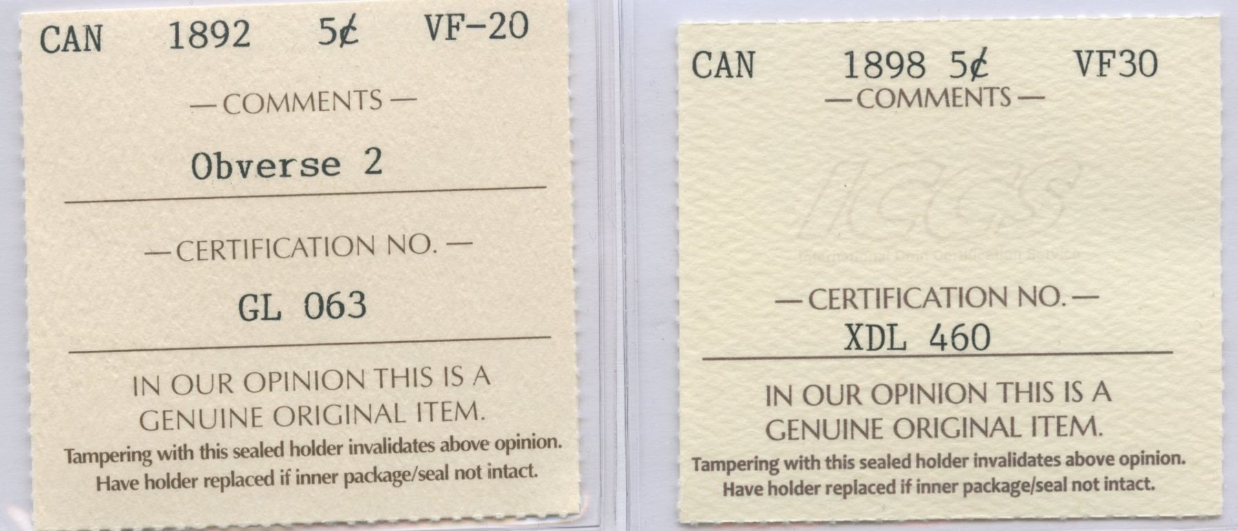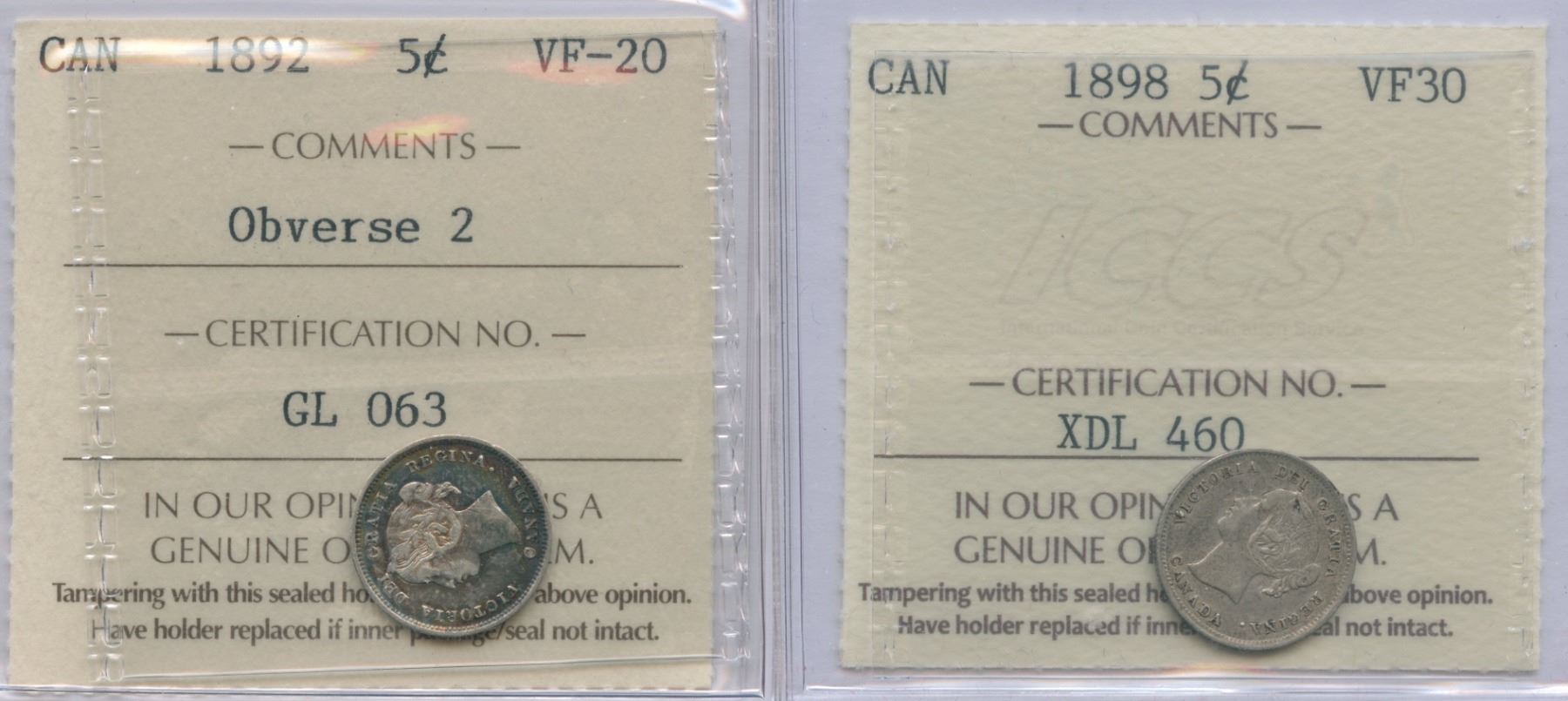 1892 ICCS VF-20; Obverse 2; Older 2-letter certificate || 1898 ICCS VF30. 2 Pcs.