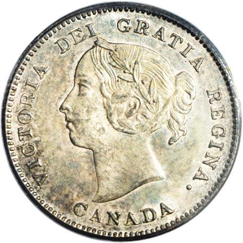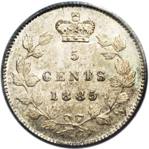 <B>Victoria 5 Cents 1885 Small 5,</B></I> Ex: Belzberg Collection, KM2, MS65 PCGS. Well struck with pinkish-gray toning over slightly muted luster. The Large and Small 5 varieties for this year are of similar rarity. Only one piece has been certified finer by PCGS.<BR><I>From the Dominion Collection.</B></I>