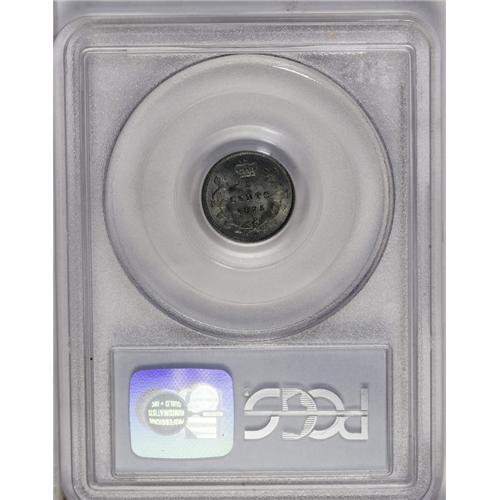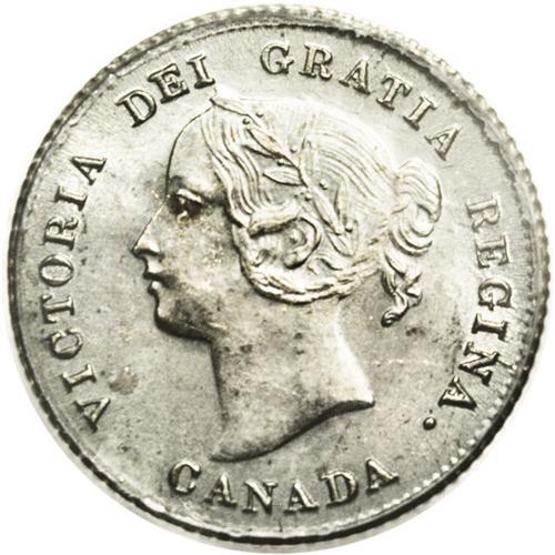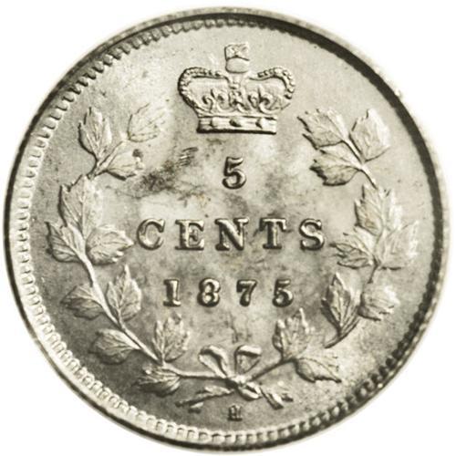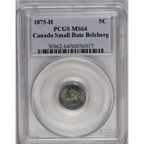 <B>Victoria 5 Cents 1875-H Small Date,</B></I> Ex: Belzberg Collection, KM2, MS64 PCGS. Even pearl-gray toning with smooth surfaces and no significant imperfections. Tied for the finest certified by PCGS. This is the finest example of this storied issue that we have seen.<BR><I>From the Dominion Collection.</B></I>