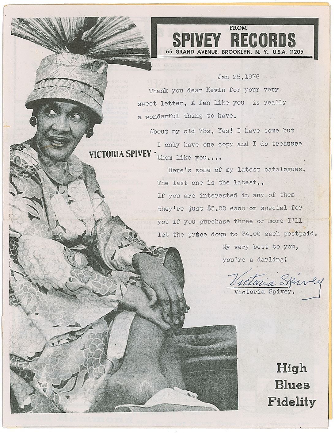 Blues singer and songwriter (1906–1976) sometimes known as 'Queen Victoria,' who was a pioneering blues recording artist of the 1920s along with greats like Bessie Smith, Mamie Smith, and Alberta Hunter. She co-founded Spivey Records in 1962. TLS, one page, 8.5 x 11, Spivey Records letterhead, January 25, 1976. Letter to a fan, in part: "About my old 78s. Yes! I have some but I only have one copy and I do treasure them like you….Here's some of my latest catalogues. The last one is the latest. If you are interested in any of them they're just $5.00 each." Stapled to the letter are three pages of Spivey Records catalog flyers, advertising releases from the likes of Lefty Dizz, Sparky Rucker, and Otis Spann. In fine condition. Accompanied by the original mailing envelope.