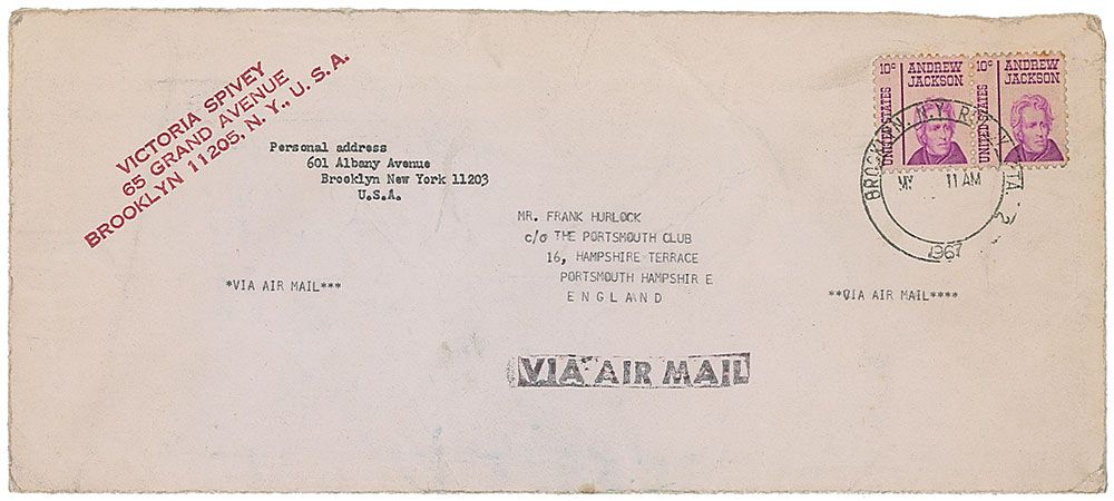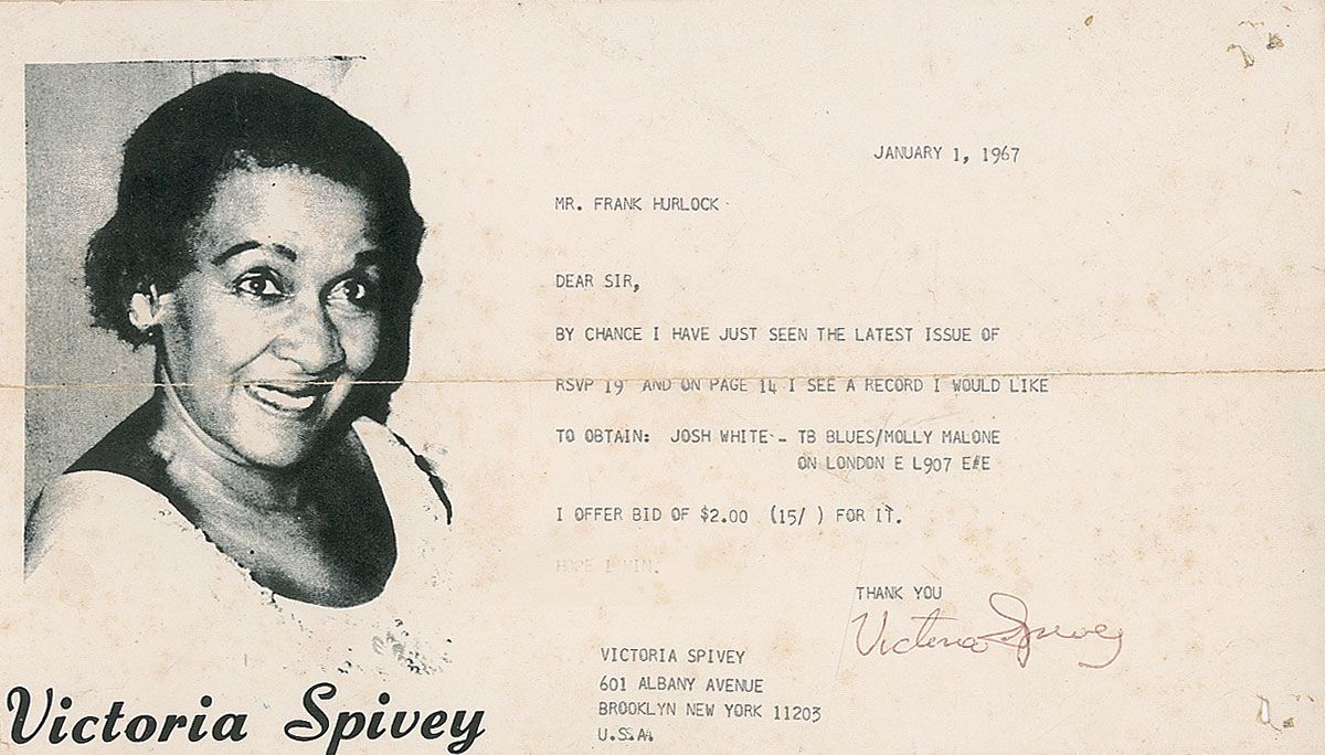 Prolific blues singer and songwriter (1906–1976). TLS, one page, 8.5 x 4.75, personal stationery, January 1, 1967. Letter to Frank Hurlock. In part: “I have just seen the latest issue of RSVP 19 and on page 14 I see a record I would like to obtain: Josh White—TB Blues/Molly Malone on London E L907 E#E.” Also includes an unsigned typed follow-up letter, one page, 4.5 x 9, personal stationery, May 5, 1967. In part: “It is me again, regarding the Josh White record I would like to say that I have never received same…If I did not win it please credit me and keep an eye open for another copy.” In overall very good condition, with mailing folds, light overall foxing, and tack holes to corners. Accompanied by the original mailing envelope for the second letter.