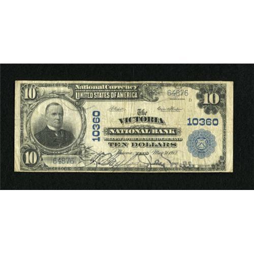 <B>Victoria, TX</B></I> - $10 1902 Plain Back Fr. 624 <B>The Victoria NB</B></I> Ch. # 10360<BR> The paper is original and fully intact. The stamped signatures remain bold. <B>Fine.</B></I><BR><I>From The Rolling Plains Collection</B></I><BR><BR><b>Shipping:</b> Coins & Currency (<a target="_blank" href="http://www.heritageauctions.com/common/shipping.php">view shipping information</a>)