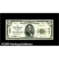 <B>Victoria, TX</B></I> - $5 1929 Ty. 1 <B>The Victoria NB</B></I> Ch. # 10360<BR>Although the latest edition of the Kelly census lists 41 survivors from here in the 1929 series, the overall statistics are somewhat misleading in evaluating this example. A new addition to the census, it is only the fifth $5 Type 1 to surface. A bright, crisp and otherwise <B>Extremely Fine</B></I> note, it does have a small void in the paper just inside the right side margin. Lot:17005