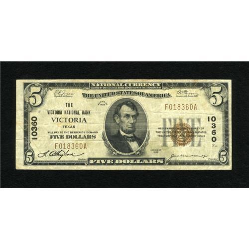 <B>Victoria, TX</B></I> - $5 1929 Ty. 1 <B>The Victoria NB</B></I> Ch. # 10360<BR>This <B>Fine</B></I> $5 is bright for the grade while the edges are undisturbed.<BR><BR><b>Shipping:</b> Coins & Currency (<a target="_blank" href="http://www.heritageauctions.com/common/shipping.php">view shipping information</a>)