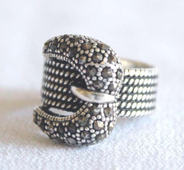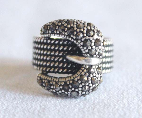 Victoria Townsend Marcasite Sterling Belt Buckle Ring, Size 7, very unusual wide sterling silver with inset marcasite stones, measures .75''W, 7.04g in total wt.