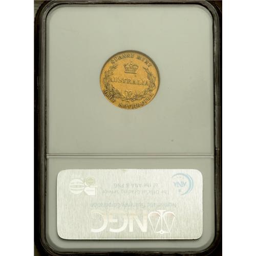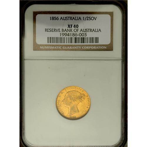 <B>Victoria gold 1/2 Sovereign 1856, </B></I>KM1, XF40 NGC Reserve Bank of Australia (RBA), lightly toned with a trace of luster in the legends, one noticeable contact mark in the left obverse field. Very scarce two year type.<BR><BR><b>Shipping:</b> Coin/Currency (<a target="_blank" href="http://www.heritageauctions.com/common/shipping.php">view shipping information</a>)