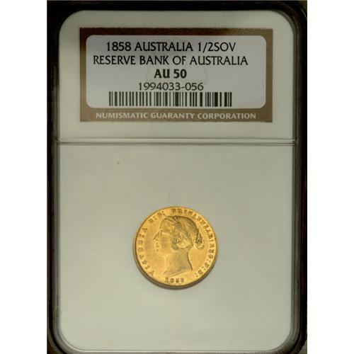 <B>Victoria gold 1/2 Sovereign 1858, </B></I>KM3, AU50 NGC RBA, lightly toned with noticeable luster in the legends, an attractive example of this early date.<BR><BR><b>Shipping:</b> Coin/Currency (<a target="_blank" href="http://www.heritageauctions.com/common/shipping.php">view shipping information</a>)