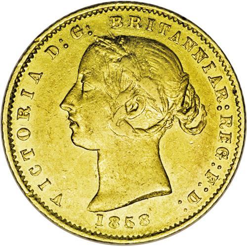 <B>Victoria gold 1/2 Sovereign 1858, </B></I>KM3, VF+, some luster remains in the legends, few tiny rim taps.