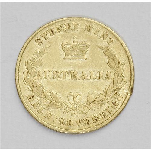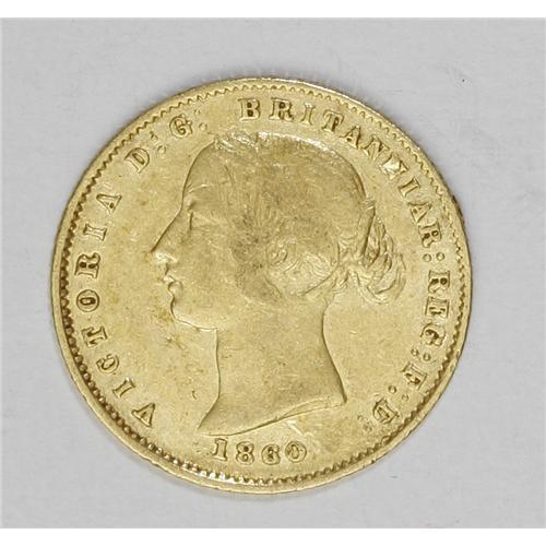 <B>Victoria gold 1/2 Sovereign 1860, </B></I>KM3, AVF, typical contact marks and a large edge bruise at 4 o'clock on the reverse. Very scarce date.