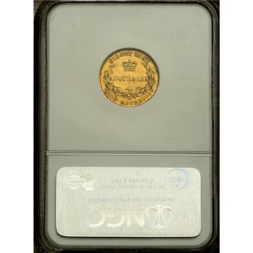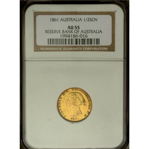 <B>Victoria gold 1/2 Sovereign 1861, </B></I>KM3, AU55 NGC RBA, an attractive original coin with considerable mint luster. Scarce grade for this type.<BR><BR><b>Shipping:</b> Coin/Currency (<a target="_blank" href="http://www.heritageauctions.com/common/shipping.php">view shipping information</a>)