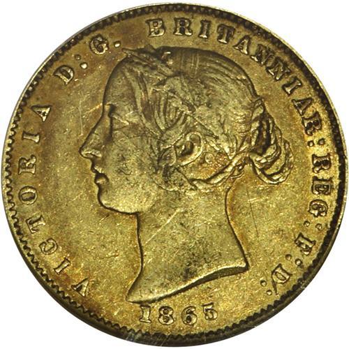 <B>Victoria gold 1/2 Sovereign 1865, </B></I>KM3, XF45 NGC RBA, heavily toned with some light scratches on the bust. Low mintage date.<BR><BR><b>Shipping:</b> Coin/Currency (<a target="_blank" href="http://www.heritageauctions.com/common/shipping.php">view shipping information</a>)