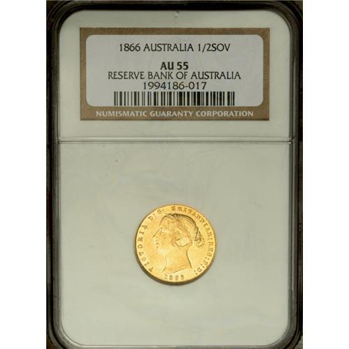 <B>Victoria gold 1/2 Sovereign 1866, </B></I>KM3, AU55 NGC RBA, a premium example with abundant mint luster, very scarce this nice.<BR><BR><b>Shipping:</b> Coin/Currency (<a target="_blank" href="http://www.heritageauctions.com/common/shipping.php">view shipping information</a>)
