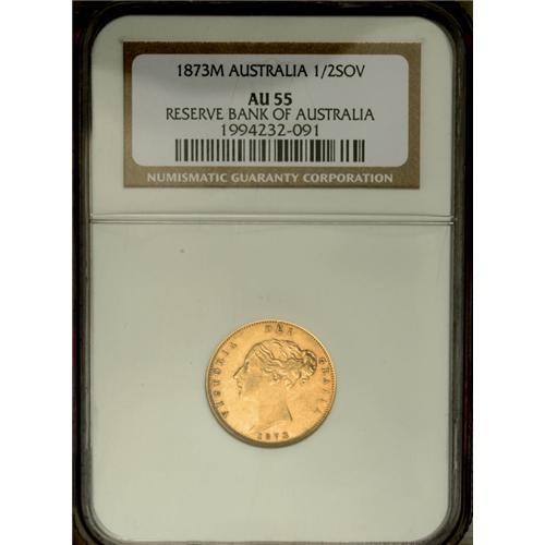 <B>Victoria gold 1/2 Sovereign 1873M, </B></I>KM5, AU55 NGC RBA, a very appealing coin with considerable mint brilliance and no distracting defects.<BR><BR><b>Shipping:</b> Coin/Currency (<a target="_blank" href="http://www.heritageauctions.com/common/shipping.php">view shipping information</a>)