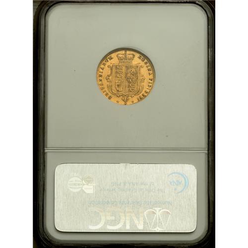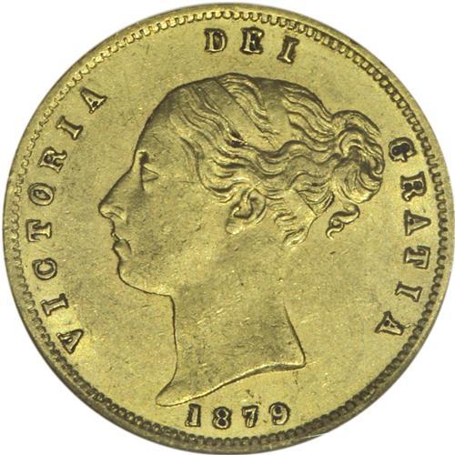 <B>Victoria gold 1/2 Sovereign 1879S, </B></I>KM5, AU55 NGC RBA, very sharp details, lightly toned with considerable original luster, the date is obviously double-punched.<BR><BR><b>Shipping:</b> Coin/Currency (<a target="_blank" href="http://www.heritageauctions.com/common/shipping.php">view shipping information</a>)